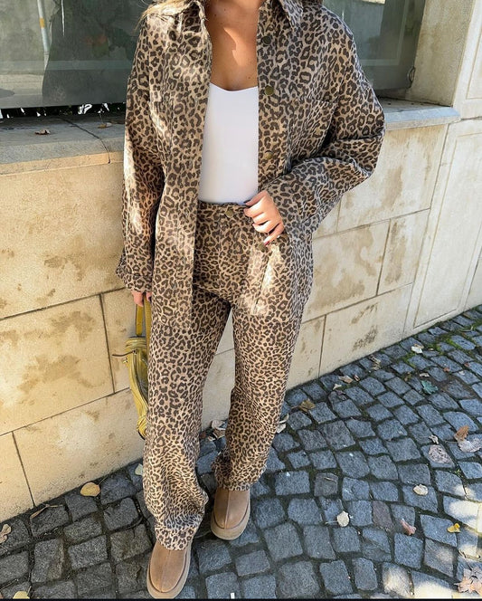 Leopard Pattern Denim Shirt Pants Set